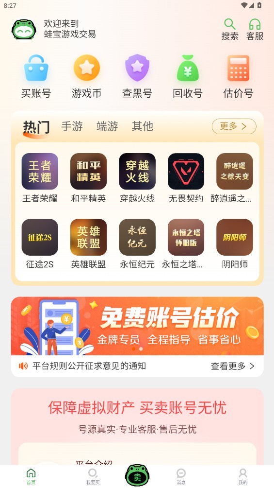 应用详情:蛙宝是专业的游戏账号交易平台,提供账号买卖、估价回收、中介担保等服务,覆盖百余款热门手游。蛙宝严格审核交易双方信息,提供电子合同法律保障,确保交易安全高效,让玩家买得放心、卖得省心!