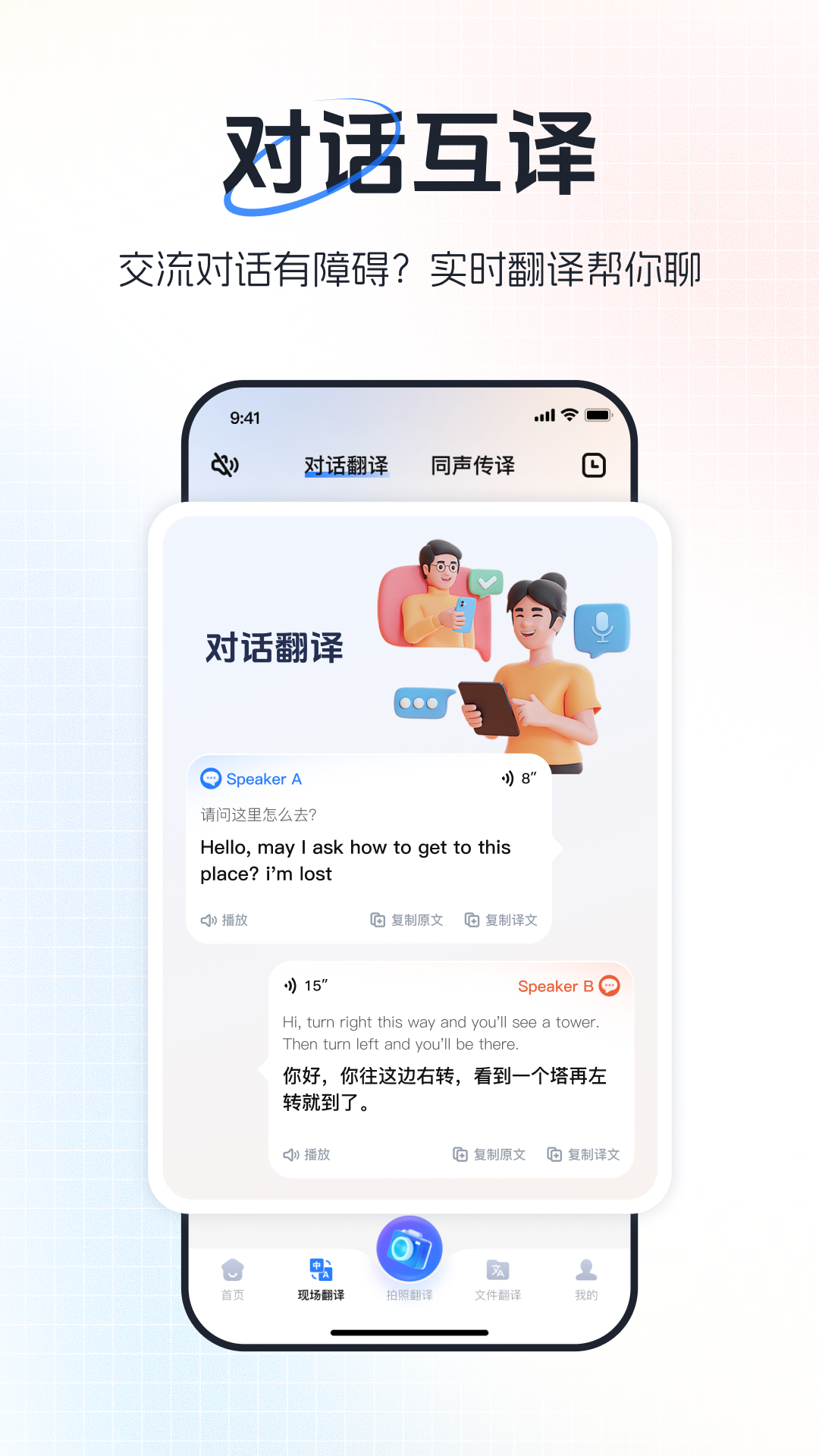 • 对话模式:按住说话,自动识别互译,面对面聊得像母语。