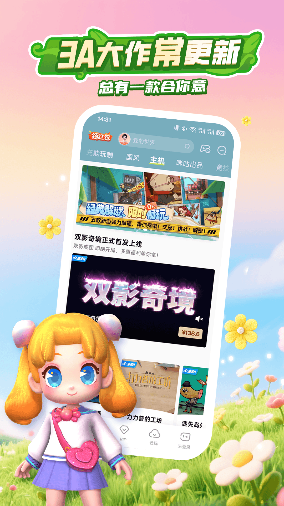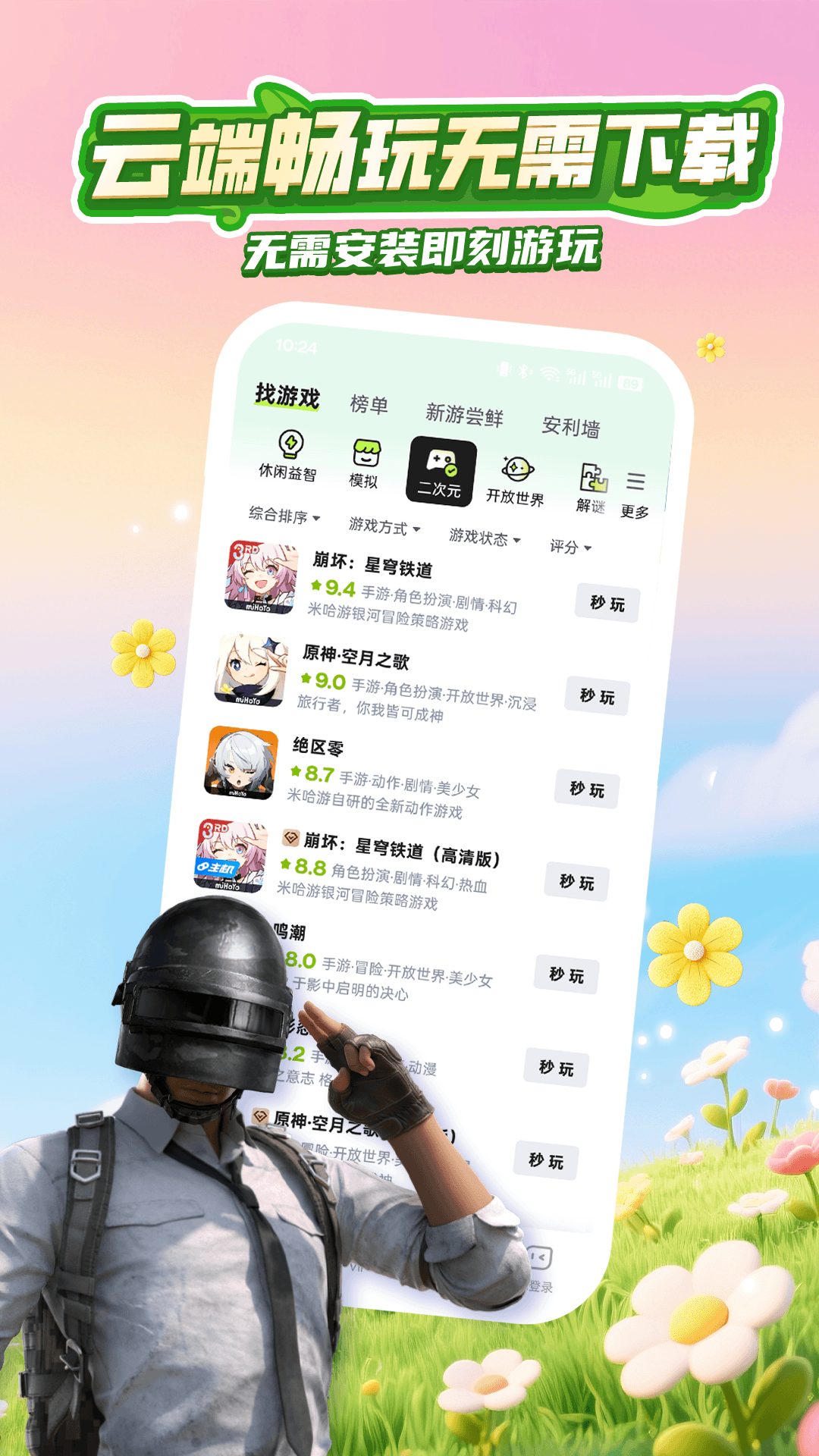 应用详情:咪咕快游,是一款在线畅玩的5G戏互动平台。海量正版高品质游戏,免下载免安装,与好友一起随时随地开黑,即点即畅玩!《原神》《崩坏:星穹铁道》《地铁跑酷》《旋转轮胎:泥泞奔驰》《世界摩托大奖赛》《我的朋友佩德罗》等热门手游、3A主机大作通通都有!