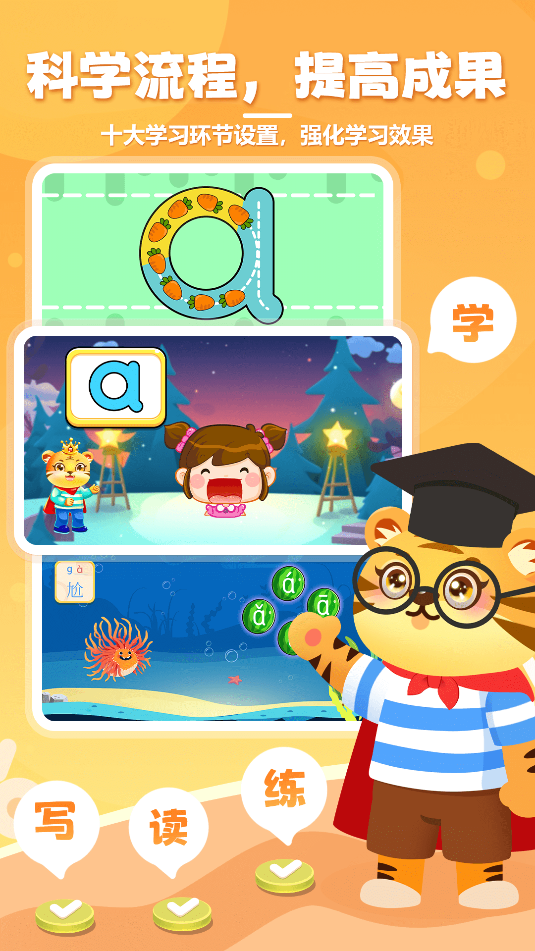 应用详情:幼小衔接拼音启蒙课程,轻松学会拼音字母和拼音拼读,包括声母、韵母、整体认读...